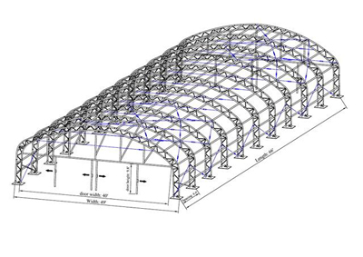 Schematic of one of our inexpensive and very affordable Clear Span Temporary & Portable Truss Hangars.